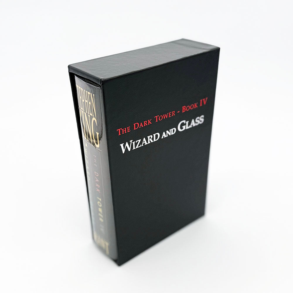 Featuring a genuine leather outer wrap this slipcase has the title and author stamped in silver on the spine. The front of the slipcase has "Wizard and Glass" in silver and "Dark Tower Book IV " in red.